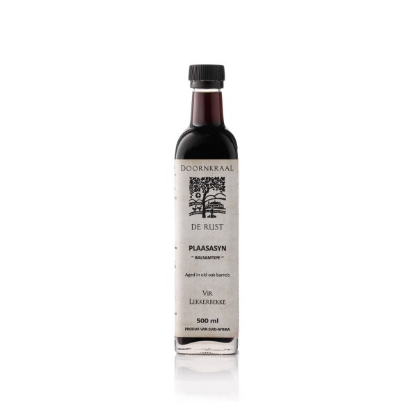 Op Doornkraal word hierdie 12 jaar oue wynasyn gemaak van die dessertwynmoeder wat al meer as 70 jaar in die ou eikehoutvatte van die kombuiskelder woon. Dit bevat geen swael of enige ander preserveermiddels nie. At Doornkraal this 12 year old wine vinegar is made from a mother which is older than 70 years. Unfiltered. 500ml.